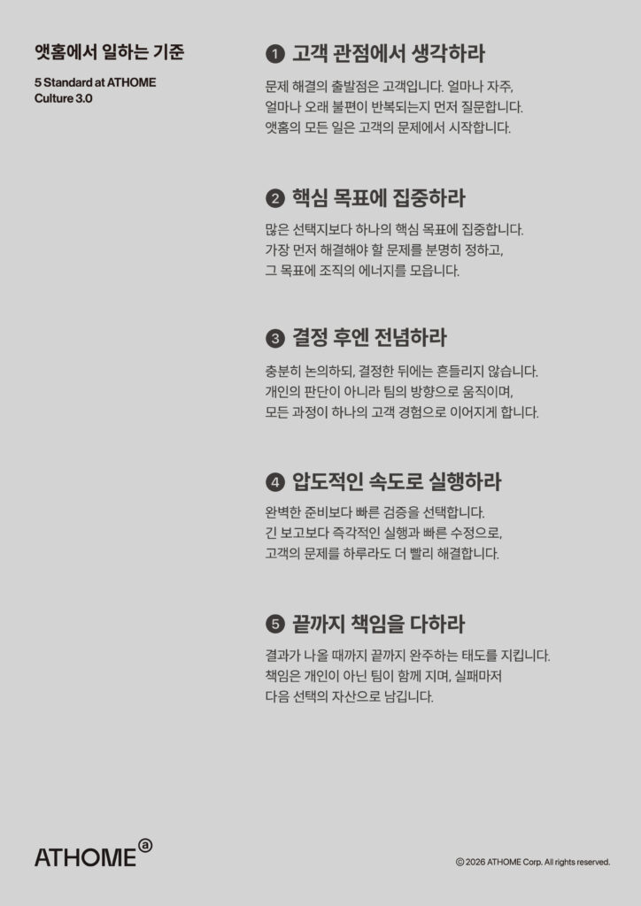 고객 관점에서 문제를 정의하는 힘, 핵심 목표에 집중하는 실행력, 결정 후 전념하는 몰입, 압도적인 속도, 끝까지 책임지는 자세. 이 다섯 가지 일하는 방식에 공감하고 그 안에서 성장하고 싶다면, 앳홈은 충분히 고민해볼 만한 선택입니다.