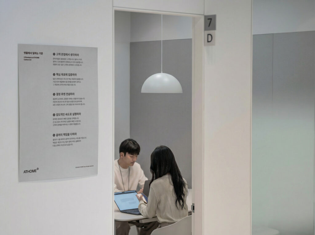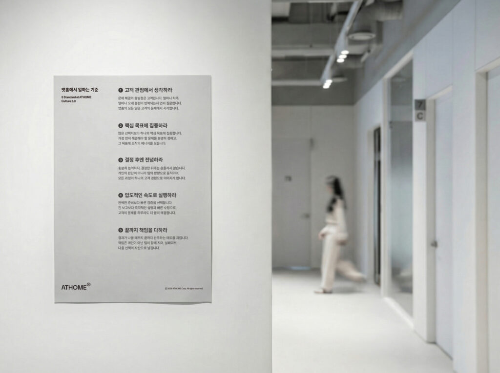 앳홈이 말하는 속도는, 무작정 서두르는 것이 아닙니다. 완벽한 준비보다 빠른 검증, 긴 보고보다 즉각적인 실행, 실패를 숨기기보다 빠른 수정. 이는 무모함이 아니라, 결정한 문제를 끝까지 책임지고 해결하겠다는 실행 방식입니다.